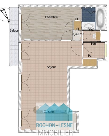 Comprenant: Un hall d'entrée avec placard mural, un séjour avec accès balcon, cuisine ouverte sur séjour: meublée et équipée (plaques induction, hotte, frigo et micro-ondes / four), une chambre avec placard mural + accès balcon, une salle de bains et un WC séparé. Chauffage individuel électrique bonne orientation.